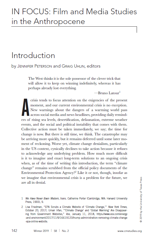 Co-edited with Graig Uhlin, “In Focus” dossier on Film and Media Studies in the Anthropocene, Journal of Cinema and Media Studies 58:2 (Winter 2019): 142-146.