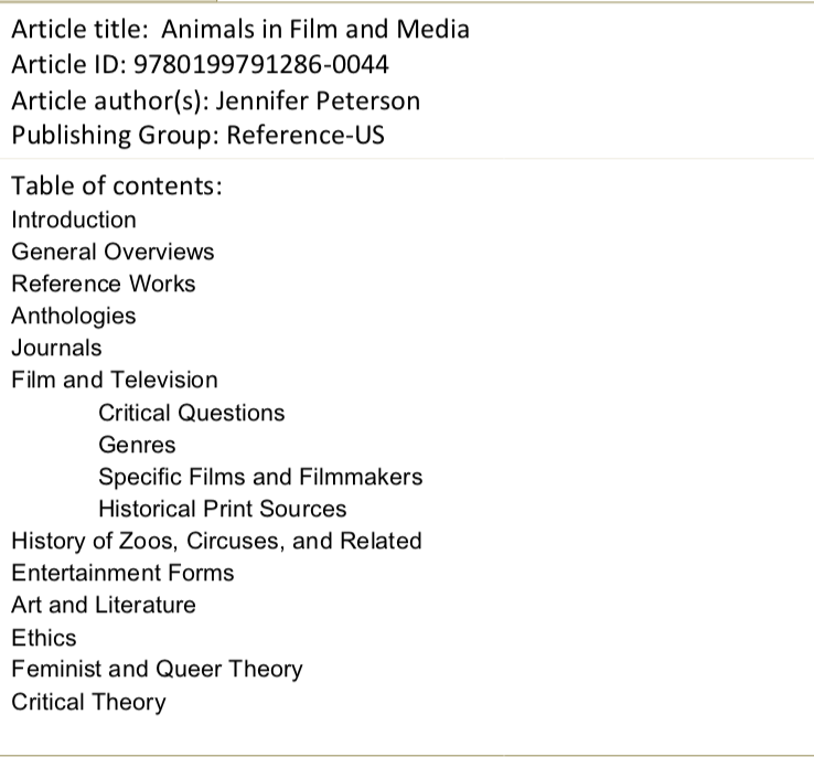 “Animals in Film and Media,” in Oxford Bibliographies in Cinema and Media Studies, ed. Krin Gabbard (New York: Oxford University Press, 2013).